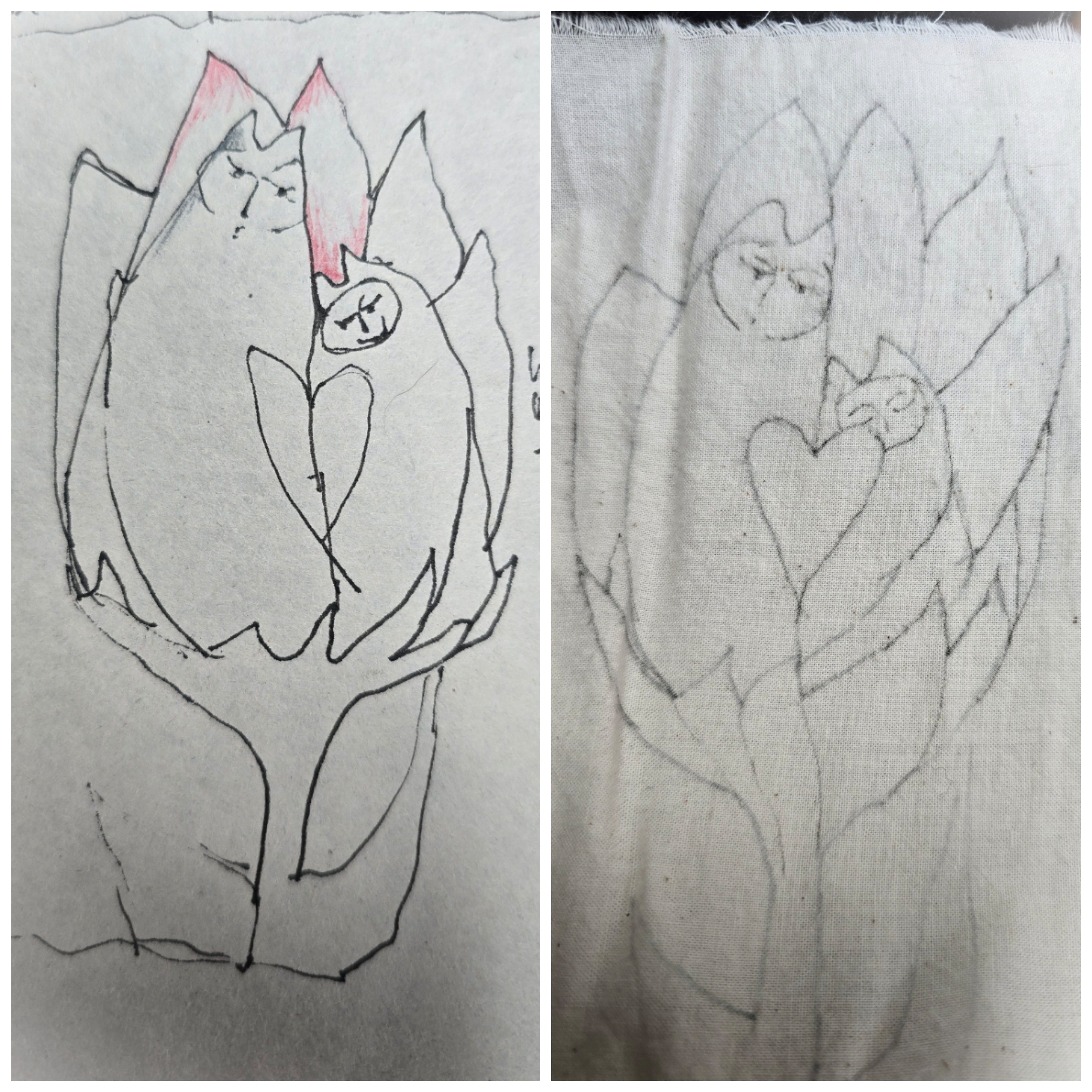 The drawing ( left) from around a year ago. I rarely date anything but I did this time. How Love might Flower was the thought. Today transferred to cloth. A piece of muslin. Thin muslin, some muslin feels like paper. This one is soft and easy to stitch through. When I say transfer I don’t mean trace or any other methods to exactly reproduce the image. I like to just look for a while and then look away and draw it again. A new moment. From an old thought. Close enough this time but sometimes I wander off. Nursing my thumbs, better today.